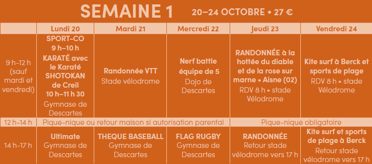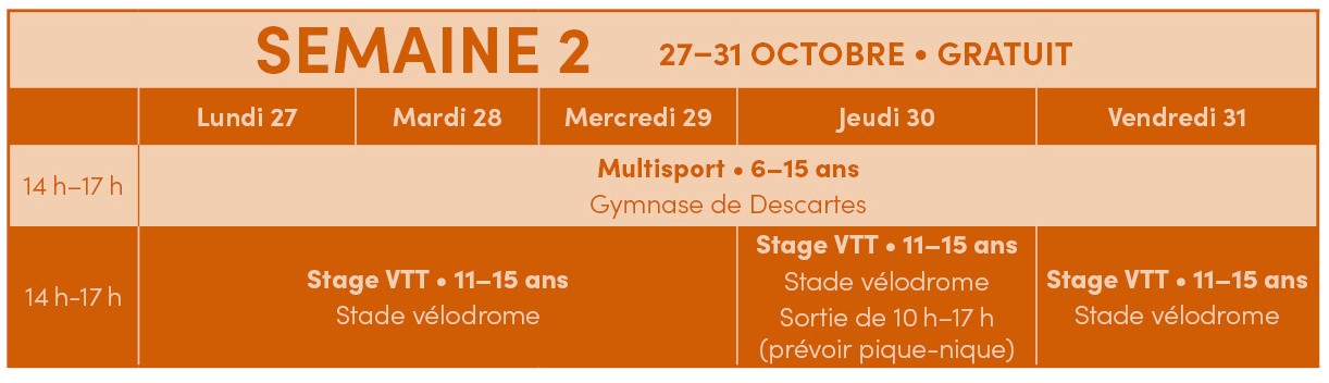 - 2ème semaine : multisports du 27 au 31 octobre au gymnase Descartes de 14h à 17h. Pour les 6-15 ans, gratuit